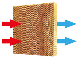 蒸發(fā)降溫是一種自然現(xiàn)象,就如同當(dāng)風(fēng)吹過海面時(shí)會(huì)導(dǎo)致水份蒸發(fā),從而使空氣溫度下降。為了能在畜禽舍、溫室、廠房?jī)?nèi)人為的再現(xiàn)這一物理過程,您必須有一個(gè)能讓水份汽化的表面,需要能使該表面濕潤(rùn)的供水系統(tǒng),還需要有讓空氣穿過該表面并使整個(gè)系統(tǒng)有效運(yùn)行的控制手段。
